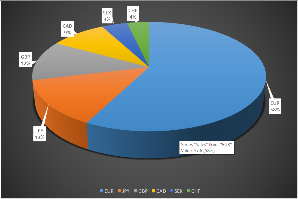 Our latest financial analysis reveals a significant pattern in the currency distribution for global sales. The Euro (EUR) stands out as the dominant currency, accounting for a substantial 58% of total sales. This dominance underscores the Euro's strong presence in international trade and its widespread acceptance as a transaction currency.